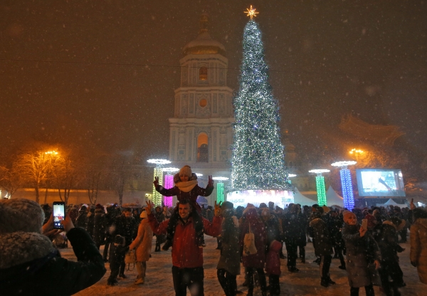 Массовые гуляния проходят в это Рождество и в центре Киева. Люди собираются возле главной елки на Софийской площади.