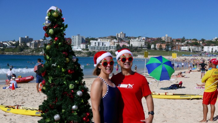 В Сиднее главный символ праздника нередко устанавливают на пляжах, а местные спасатели надевают красные шапки или "оленьи рога".