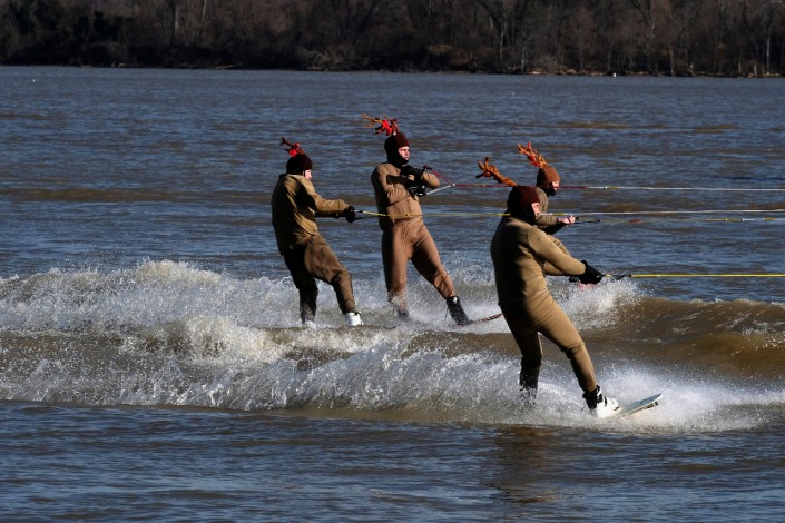 Некоторые жители американского штата Вирджиния из-за отсутствия снега развлекаются на водных лыжах.