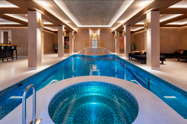На нижнем этаже находится спа-комплекс с хаммамом, бассейном, массажным кабинетом, игровой комнатой с аквариумом и еще одним баром. Также имеется подземный гараж, до которого можно добраться на стеклянном автомобильном лифте в стиле фильмов о Джеймсе Бонде.
