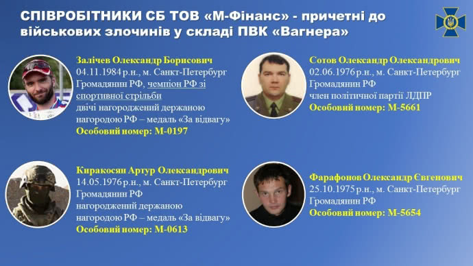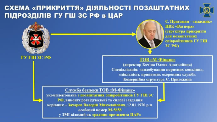 По данным СБУ, "служба безопасности ООО "М-Финанс" в ЦАР инструктирует подготовку членов местных военизированных формирований и обеспечивает тайный вывоз алмазов в Россию.
