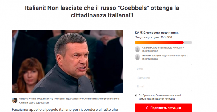 В петиции указано, что на деньги, полученные от пропаганды, Соловьев приобрел две виллы у озера Комо и хочет там поселиться. В связи с этим, пишет автор петиции, Соловьева и других российских пропагандистов необходимо включить в "список Магнитского" и запретить им въезд в Евросоюз.
