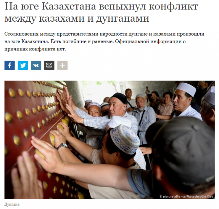 Deutsche Welle (DW) неміс халықаралық хабар тарату компаниясының орыс бөлімі Қазақстанның оңтүстігінде "қазақтар мен дүнгендер" арасында дау туғанын жазған.