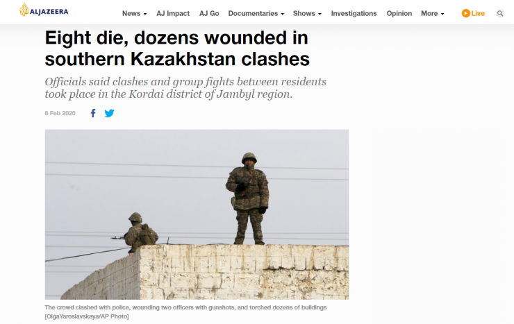 Ал америкалық АВС телеарнасының жаңалықтар бөлімі 8 ақпанда бұрын ішкі істер министрі Ерлан Тұрғымбаевтың Жамбыл облысындағы қақтығыс кезінде қаза тапқандар туралы және 40 адамның зардап шеккенін мәлімдегенін хабарлаған.