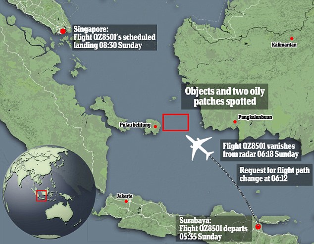 Наземные службы Индонезии сначала дали добро на смену курса, но затем запретили экипажу совершать этот маневр, поскольку на высоте примерно 10 километров летел другой борт. Почти сразу после этого авиалайнер пропал с экранов радаров, не подав предварительно сигналов бедствия. Об этом сообщил чиновник индонезийской государственной компании, отвечающий за управление воздушным движением.