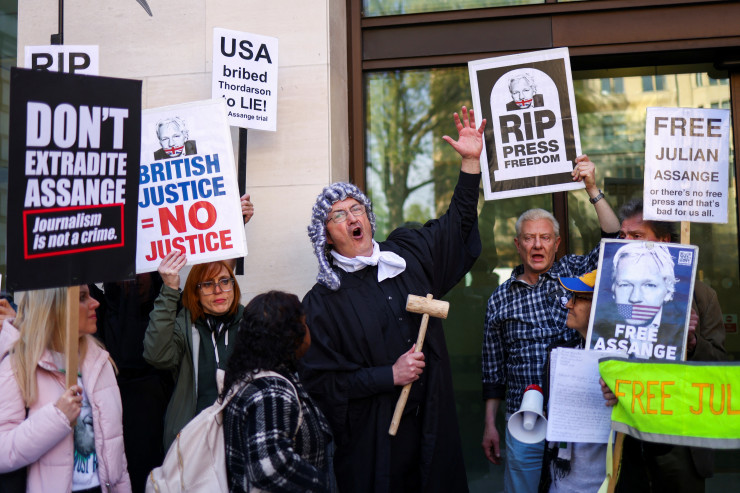 Сторонники Ассанжа с плакатами и транспарантами в его поддержку скандируют требования о его освобождении перед входом в здание министерства, где на месте дежурит полиция. Они назвали экстрадицию политически мотивированной и представляющей серьезную угрозу свободе прессы.