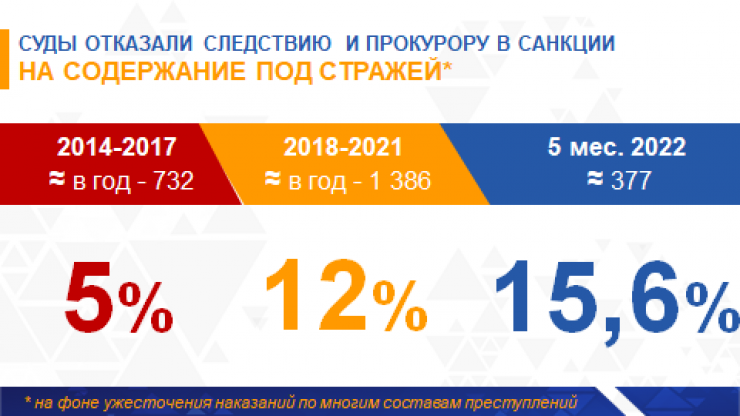 Если до 2018 года суды каждый год отказывали следствию на содержание под стражей по 5 процентам санкций, то с 2018 по 2021-й – по 12 процентам. В этом году – по 15,6 процента.