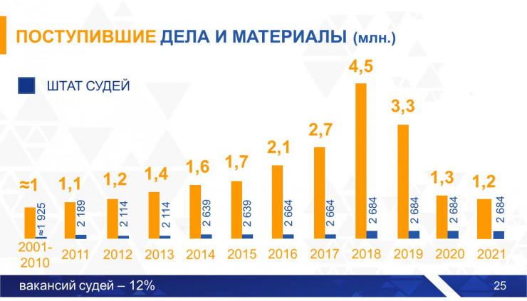 В 2019-м наши судьи разрешали столько же споров, сколько их коллеги в Украине, которых больше в 2,5 раза. Судья ВС Англии за год пишет решения по 20 делам. Наш судья – по 500. В 25 раз больше!