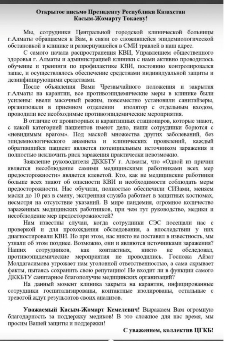 Бұған жауап ретінде Желіде Мемлекет басшысы Қасым-Жомарт Тоқаевқа жолданған хат жарияланған, онда Президенттен Алматы қаласы Орталық клиникалық ауруханада коронавирус жұқтырған дәрігерлер жағдайына көңіл аударуды сұраған.