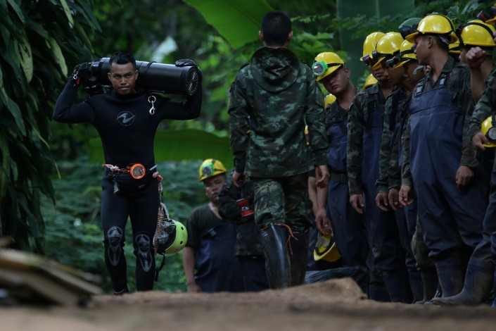 Перерыв в операции был необходим для замены использованных в воскресенье сотен запасных баллонов со сжатым воздухом, которые расставляют на протяжении всего маршрута эвакуации для восполнения запаса воздуха детей, которых выводят из пещеры в легководолазном снаряжении, и дайверов, которые их сопровождают и обеспечивают операцию.