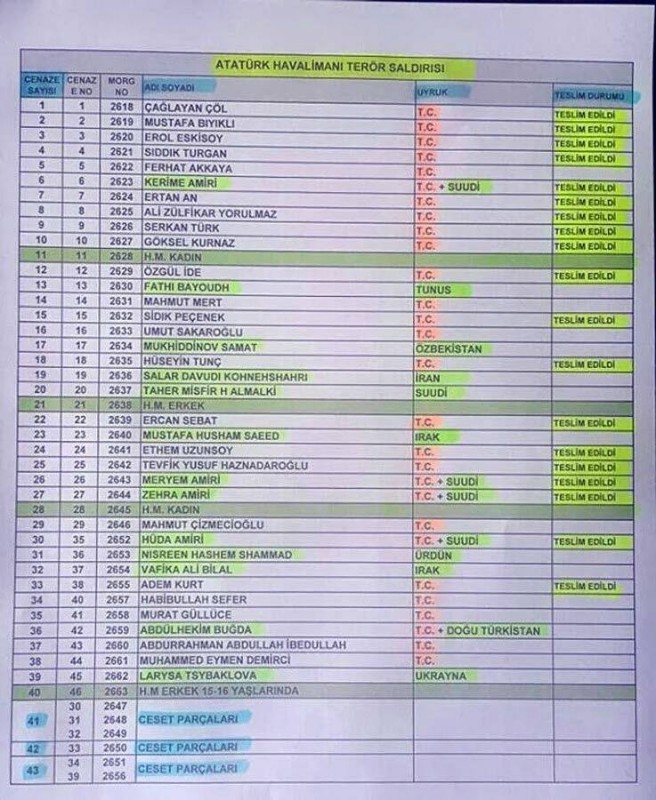 Список погибших. Среди жертв - 23 гражданина Турции, граждане Ирака, Саудовской Аравии, Ирана, Украины, Туниса, Узбекистана, Иордании, Китая.