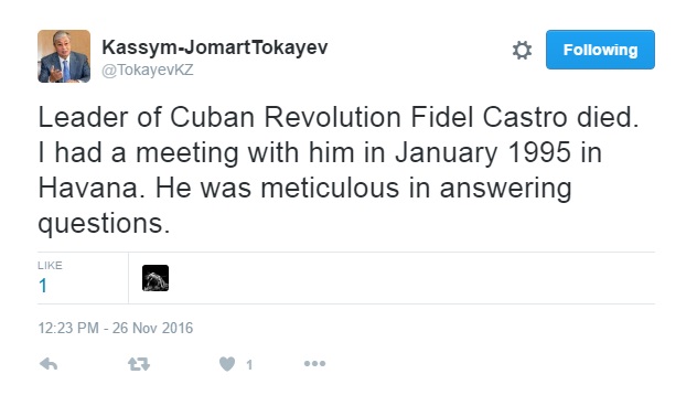 "Лидер кубинской революции Фидель Кастро умер. У меня была встреча с ним в январе 1995 года в Гаване. Он был дотошный, отвечая на вопросы", - написал Токаев на своей странице в Twitter.