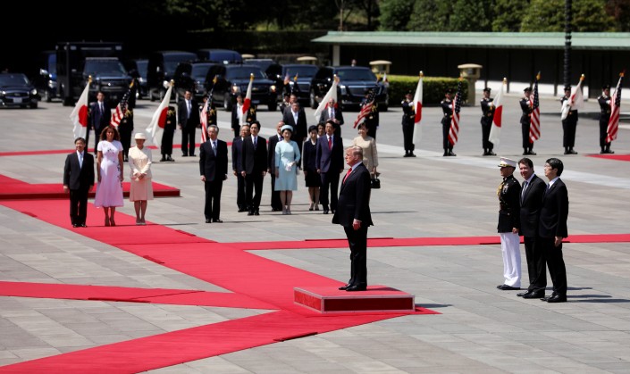 Для приветствия американского президента перед дворцом расстелили красные ковровые дорожки и был выстроен почетный караул. Прозвучали гимны двух стран. Группа школьников приветствовала Трампа американскими и японскими флагами под музыку в исполнении духового оркестра. Затем император Японии и императрица Масако с Трампом и его супругой Меланией приветствовали государственных деятелей Японии перед тем, как удалиться во дворец.