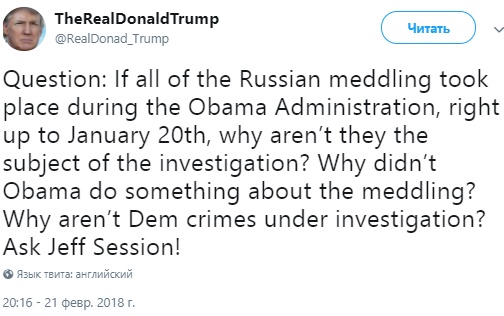 При этом глава государства предложил задать генпрокурору Джеффу Сешнсу вопрос, почему это до сих пор не сделано. "Вопрос: если все российские вмешательства имели место в период администрации Обамы, вплоть до 20 января (2017 года), почему они не являются объектом расследования? Почему Обама ничего не сделал? Почему преступления демократов не расследуются? Спросите Джеффа Сешнса!" - написал Трамп в своем Twitter.