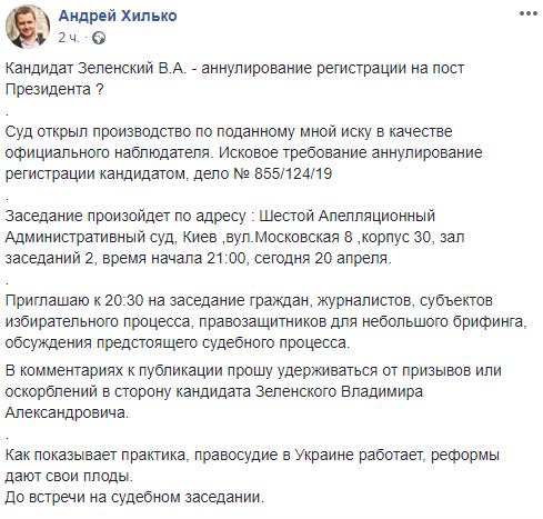 "Суд открыл производство по поданному мной иску в качестве официального наблюдателя. Исковое требование аннулирование регистрации кандидатом, дело № 855/124/19", - говорится в сообщении.