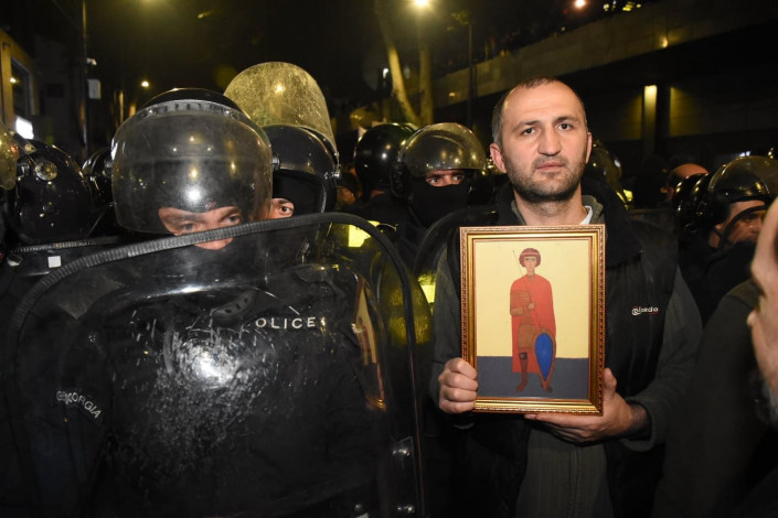 По данным МВД Грузии, полиция задержала 25 человек в Тбилиси и трех человек в Батуми, которые протестовали против скандальной картины.