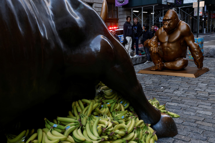 Статую обезьяны установили напротив знаменитого символа Уолл-стрит - бронзового "Атакующего быка". Вокруг статуи быка выложили 10 тысяч бананов, которые потом будут пожертвованы в местные продовольственные фонды.