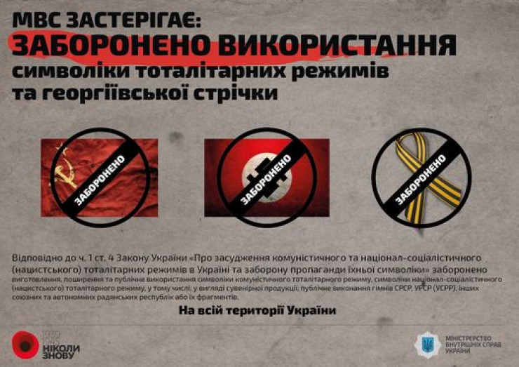 МВД Украины предостерегает от использования на всей территории страны запрещенной в Украине "символики тоталитарных режимов", что предусматривает административную и уголовную ответственность, передает Tengrinews.kz со ссылкой на "Укринформ".