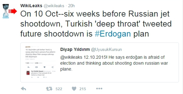 Атака на российские военные самолеты, возможно, готовилась турецкой стороной еще в октябре - почти сразу после того, как российские пилоты начали бомбить позиции боевиков ДАИШ в Сирии (30 сентября), а сам приказ об атаке мог отдать лично президент Турции Реджеп Тайип Эрдоган. Об этом на своей странице в Twitter сообщает известный своими разоблачительными статьями портал WikiLeaks.