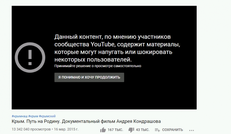 Перед просмотром ленты появляется предупреждение: "Данный контент, по мнению участников сообщества YouTube, содержит материалы, которые могут напугать или шокировать некоторых пользователей".