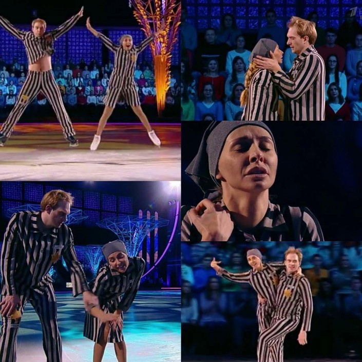 На протяжении номера артисты выделывают пируэты на льду, при этом периодически улыбаются, получают аплодисменты публики. И максимальные баллы от жюри. Оба участника при этом одеты в полосатые робы с нашитыми желтыми звездами Давида.