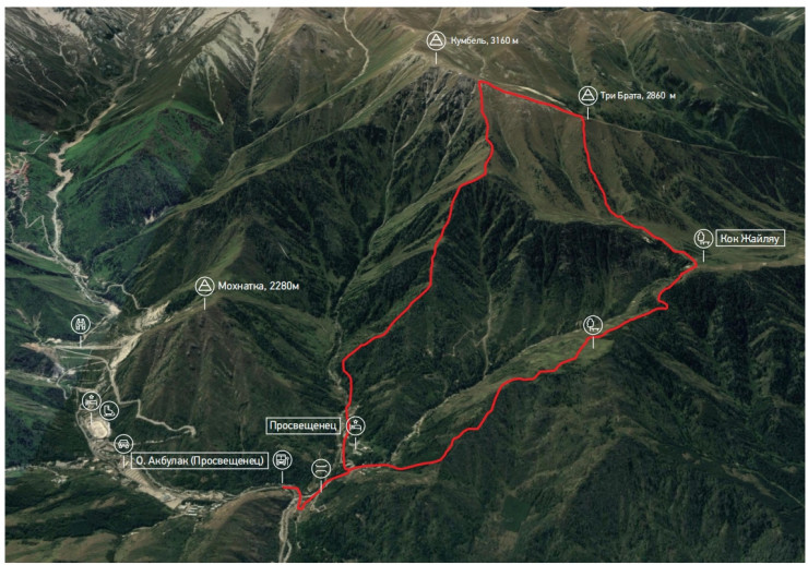 Начало совпадает с маршрутом 112. Доходим до ключа, набираем воды и от родника идем прямо вверх, по тропе, по крутому склону, в окружении мохнатых елей. Троп много, но выбираем ту, которая правее. Этот маршрут предполагает хорошую физическую подготовку, напротив тропы на Мохнатку повернуть направо. Крутые участки прерываются пологими площадками, полянками, на которых можно и нужно отдыхать. Позади крутой подъем, а вы - на открытой седловине. С нее вправо идут тропы. Одна (правая) ведет к "Просвещенцу", наш путь - по левой, опять круто поднимающейся тропе. Почти все время вы в густом лесу. Оглянешься - хорошо видна Мохнатая сопка, вдали виден пик Нурсултана (Комсомола) другие вершины. Подъем крут. Тропа в верхней своей части временами теряется, но легко отыскивается. Через 2-2,5 часа тропа выведет к триангуляционному знаку под одним из крайних гребней Кумбеля.