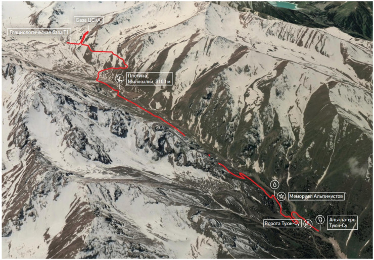 Маршрут начинается с альпинистского лагеря "Туюк-Су" и повторяет маршрут 131 до плотины Мынжилки (43.08462, 77.07827), далее по грунтовой дороге мимо поворота на Альпинград (43.08192, 77.08024) пройти около 1 км по прямой до речки, пересекающей дорогу и повернуть вверх направо по извилистой грунтовой дороге и следовать по дороге до конца. В конце дорога разветвляется на вершину Молодежная (43.05960, 77.07994) и ледник Туюксу (43.05872, 77.08299), если идти прямо до конца дороги или повернуть по ходу движения направо вверх и вы достигнете гляциологической базы Т1 (43.06806, 77.07921) и далее база ЦСКА (43.06702, 77.07402).