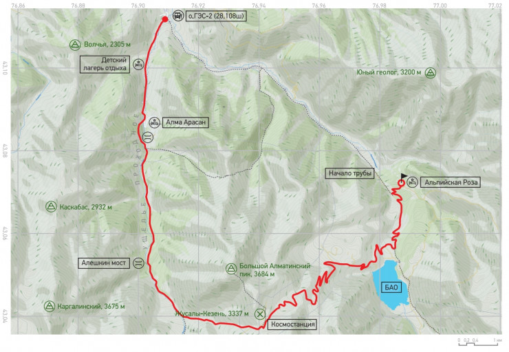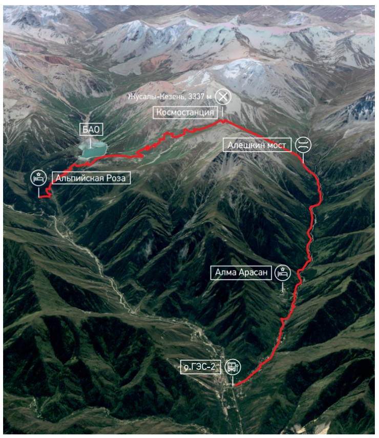 "Альпийская роза" - Большое Алматинское озеро - перевал Жусалы-Кезень - ущелье Проходное -  Алешкин мост - санаторий "Алма-Арасан" - ГЭС-2