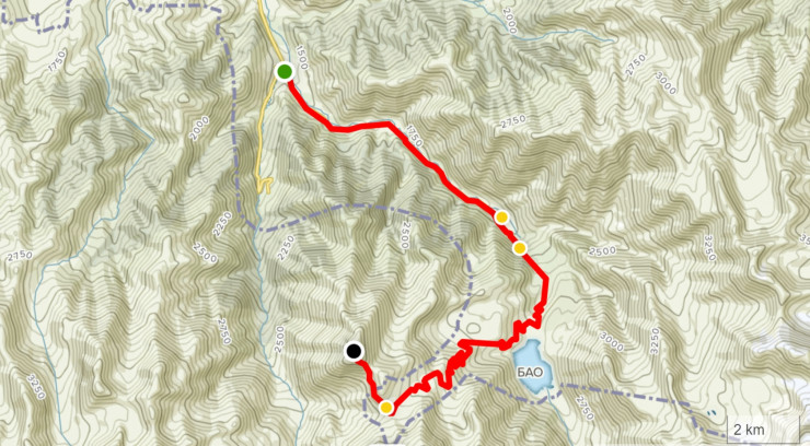 Описание: BS 28 (остановка автобуса № 28) - ГЭС-1 - Большое Алматинское озеро - перевал Жусалы-Кезень - Большой Алматинский пик - спуск по пути подъема.