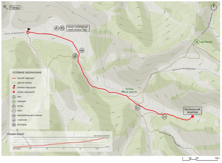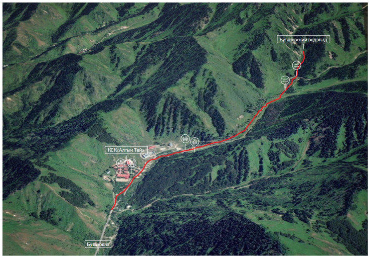 От остановки надо пройти населенный пункт Бутаковка по асфальтовой дороге примерно 40-45 минут до конца асфальта и далее до шлагбаума и места парковки (43.18290, 77.08497). До этого места можно подъехать на машине и припарковаться. После шлагбаума идите вверх по ущелью по хорошей гравийной дороге до перекрестка троп, ведущих на Бутаковский водопад и направо по ходу движения на перевал Кимасар (Кимасаровский).