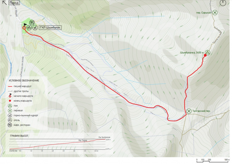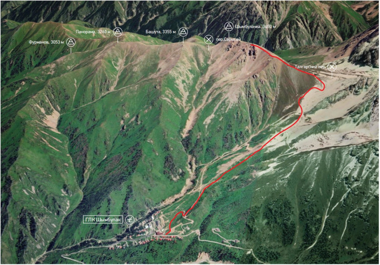Описание: Горнолыжный комплекс (ГЛК) "Шымбулак" - перевал Талгарский - вершина Чимбулачка