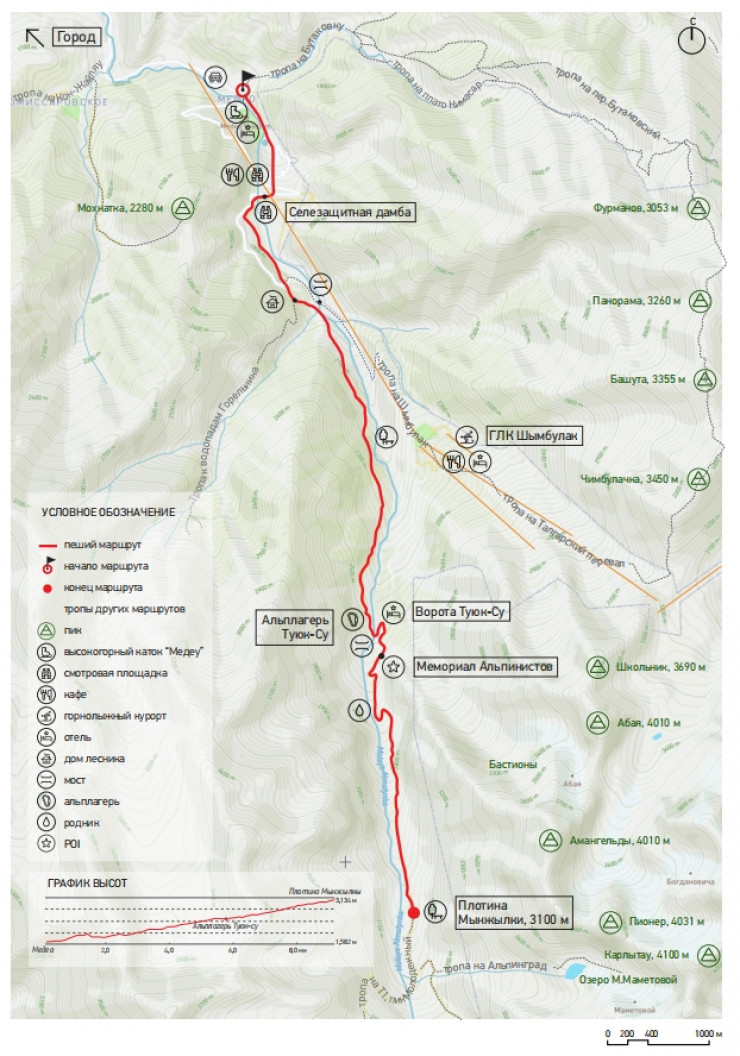 Пройдя альпинистский лагерь тропа медленно набирает высоту по дороге вы увидите бастионы Туюксу, вершины Октябренка и Йшкар-Олы. Далее, траверсируя вдоль склона через 2,8 км, вы дойдете до метеостанции на плотине Мынжилки.