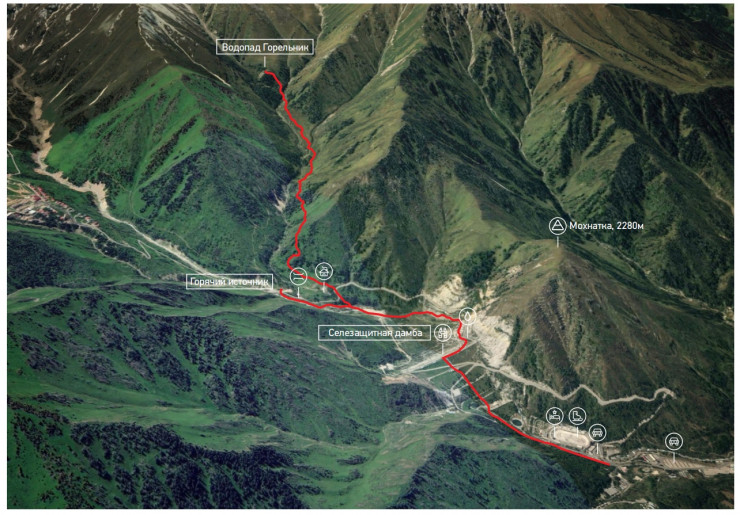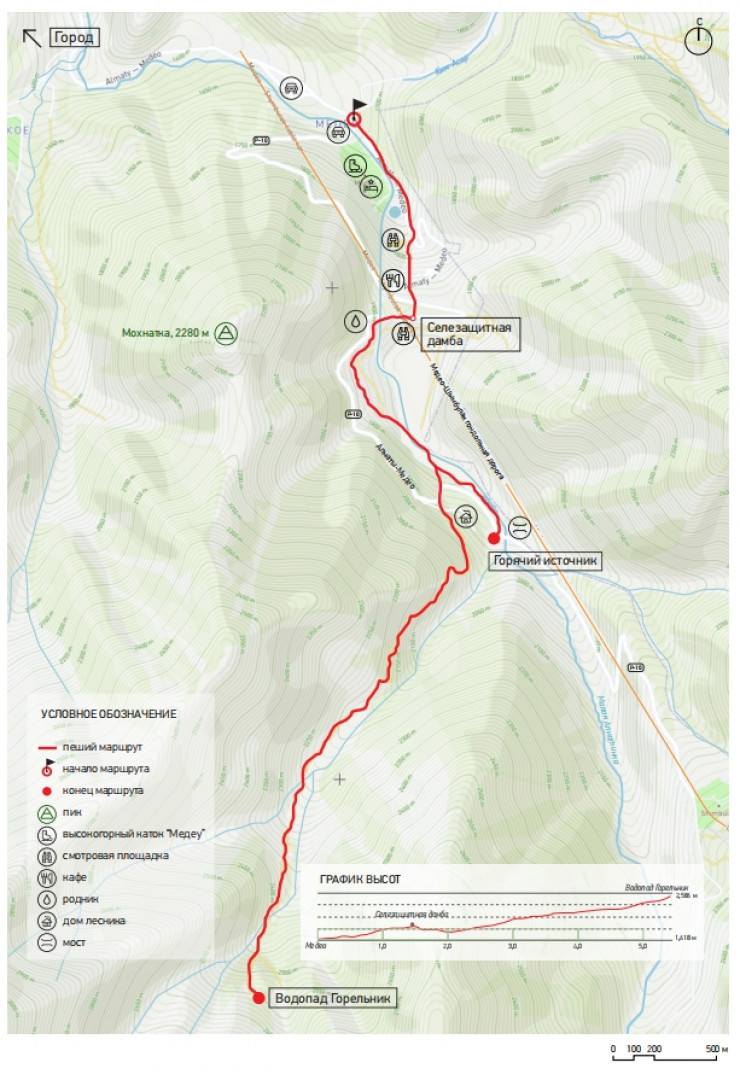Маршрут начинается от высокогорного катка "Медеу". По дороге или по лестнице подняться на селезащитную плотину и идти по дороге вверх по ущелью. Через полтора километра вы увидите строения. Дорога делает крутой поворот налево и уходит вниз, а вам следует идти прямо по проселочной дороге мимо домика лесника. Через 50 метров вы подойдете к мостику через глубокое ущелье, по дну которого течет ручей. Это и есть Горельник. Перед мостом тропа разветвляется, вам следует идти вправо. Далее будет крутой подъем по склону, тропа повернет резко вправо, а затем влево и выйдет на открытый травянистый склон. Здесь идется легко, набор высоты небольшой. Пройдя небольшой ельник, вы выйдите к гидрометеостанции, она будет слева по ходу.
